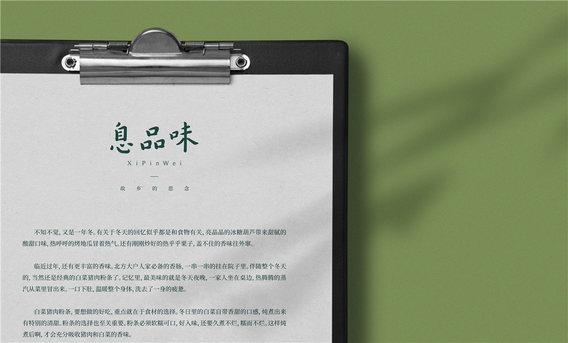 息縣,隸屬素有“江南北國,北國江南”之稱的信陽市,地跨淮河南北,四季分明,氣候濕潤,環境宜人,處處彌漫著自然的氣息。所以我們在為息品味進行品牌形象塑造時,盡量保持本真、自然的態度,不去刻意設計修飾,體現出弘一大師字體骨子里那種靜而不躁,文而不野,潤而不枯,簡而不繁的藝術境界,整體上呈現出樸實無華、自然本真的氣質。