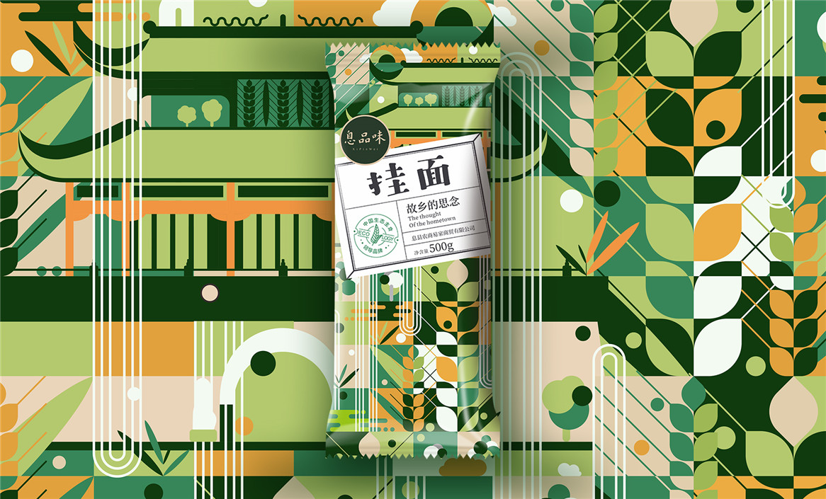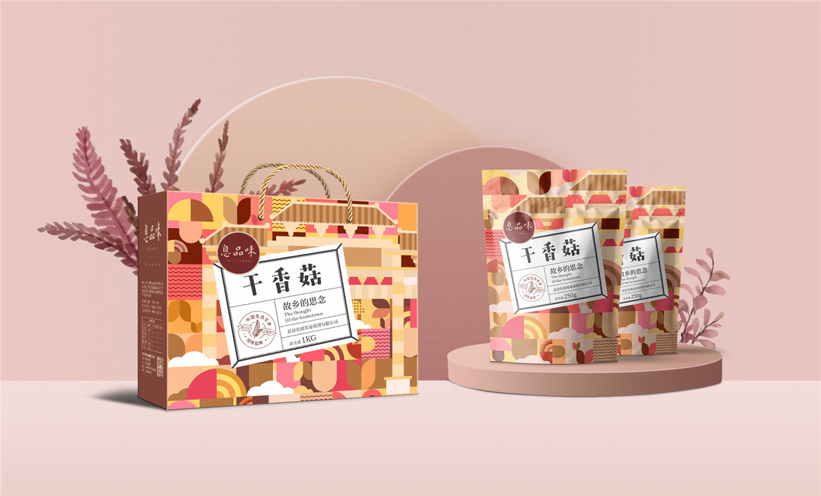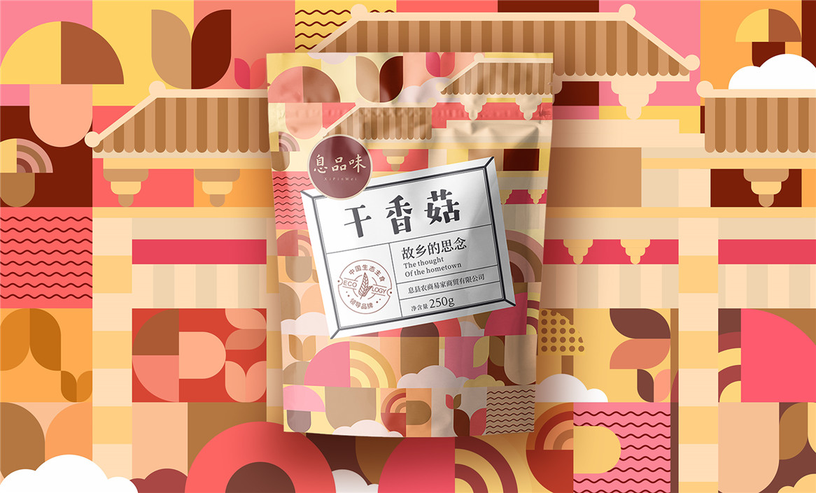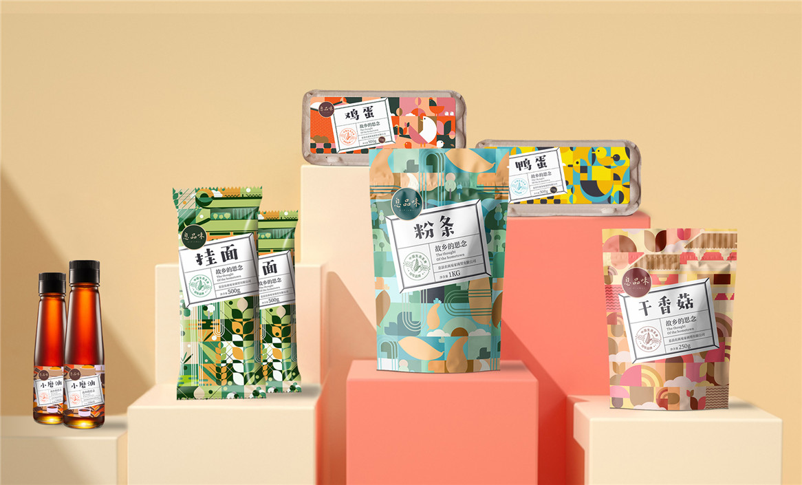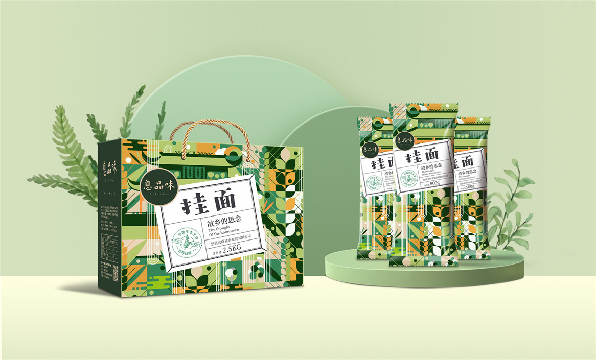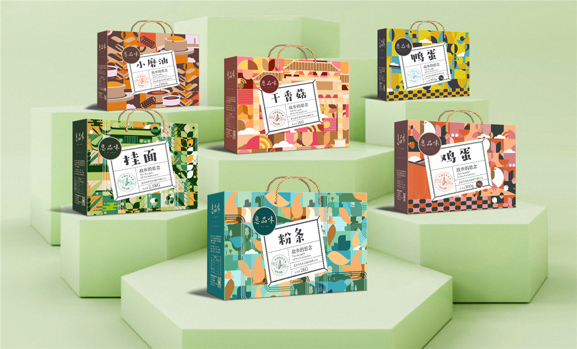 以“故鄉的思念”為品牌溝通語言,從息品味產品生態特征,地域代表文化、當地民俗民風等提取包裝設計元素,以平面幾何形態的方式把產品、產地、相關文化特征進行符號化設計視覺表達,用一種與當下農副產品市場不同的包裝表現方式設計,展現綠色新生活,迎合當下消費升級審美升級的新消費趨勢,快速建立品牌認知。