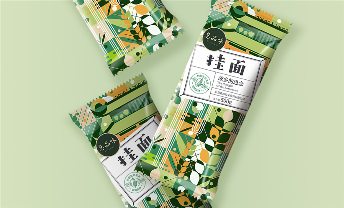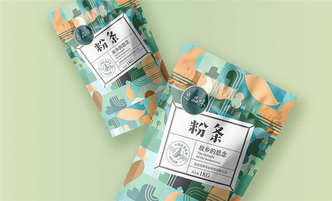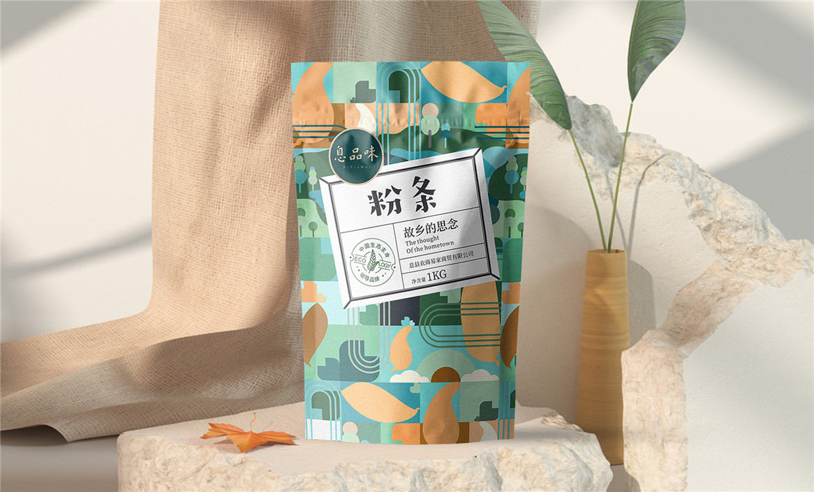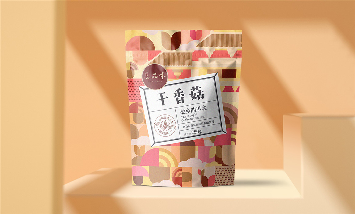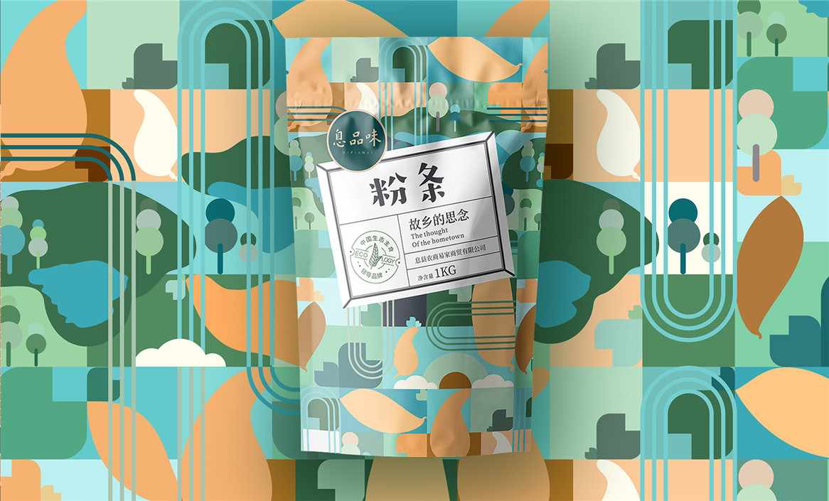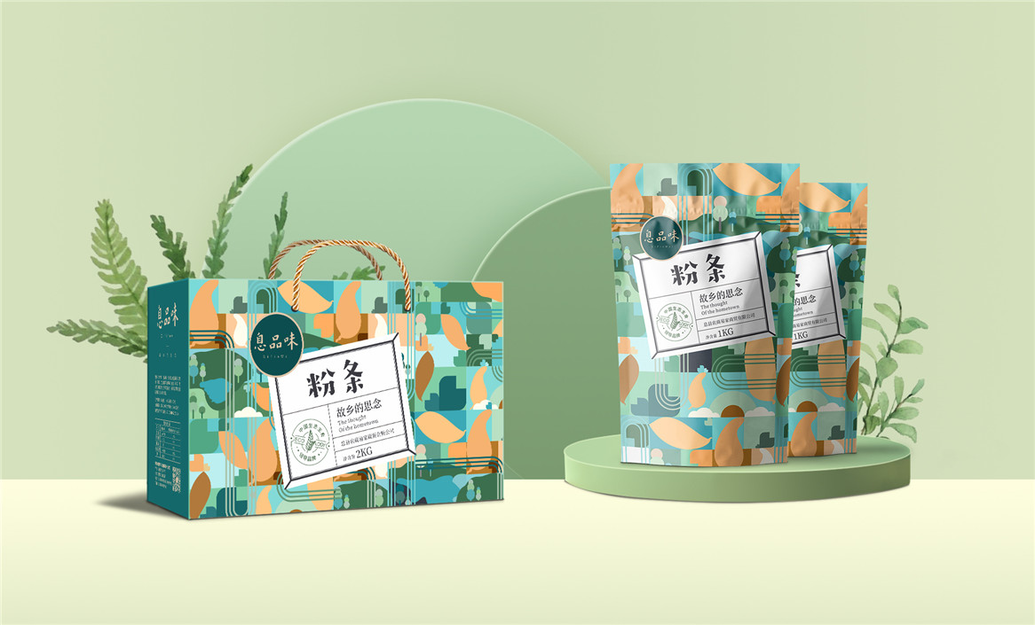 以“故鄉的思念”為品牌溝通語言,從息品味產品生態特征,地域代表文化、當地民俗民風等提取包裝設計元素,以平面幾何形態的方式把產品、產地、相關文化特征進行符號化設計視覺表達,用一種與當下農副產品市場不同的包裝表現方式設計,展現綠色新生活,迎合當下消費升級審美升級的新消費趨勢,快速建立品牌認知。