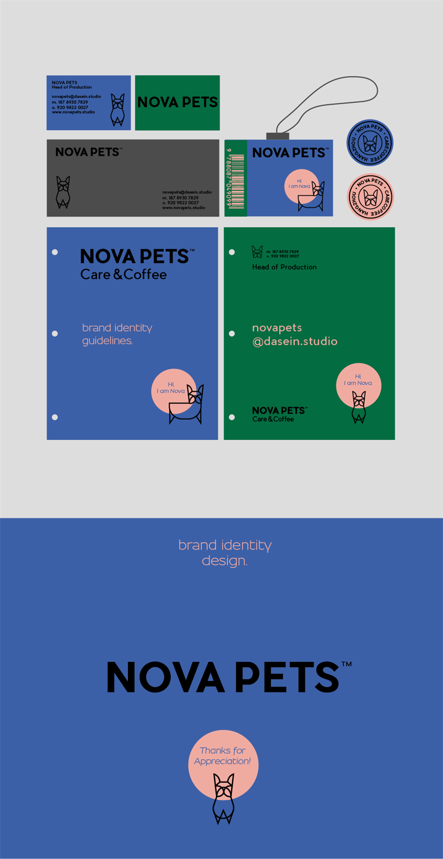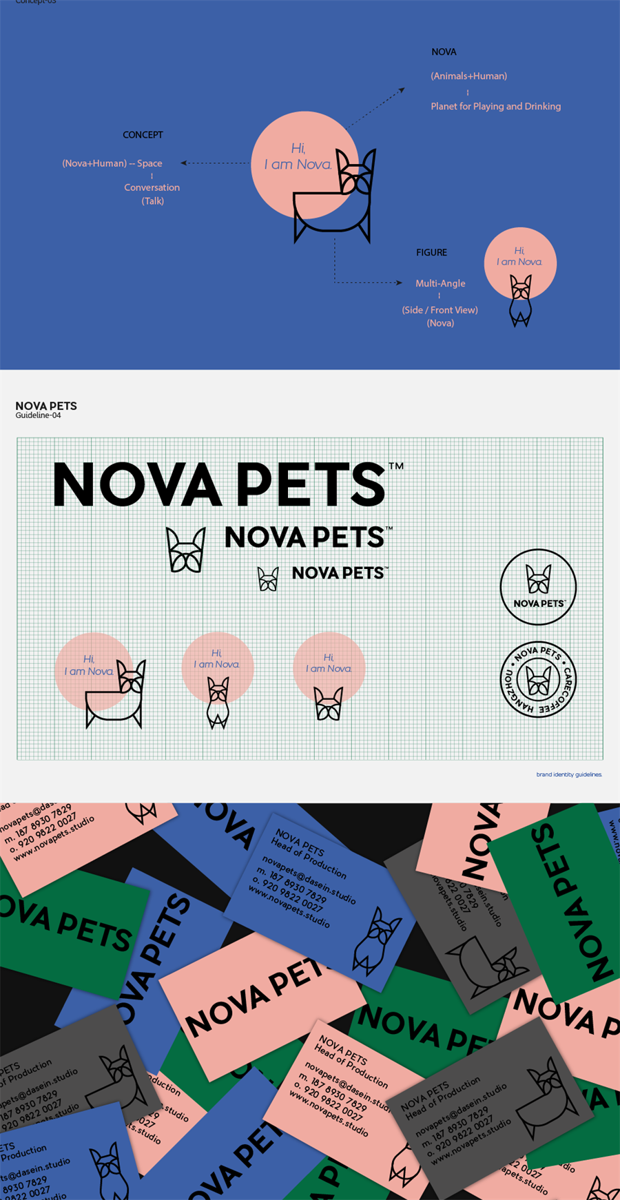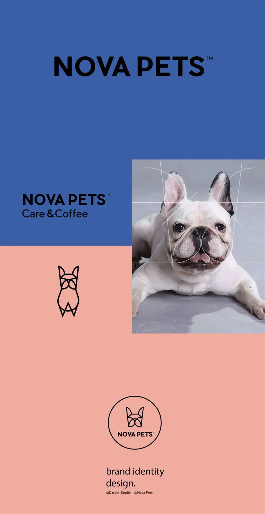 這是一個寵物店的品牌項目,客戶起名為NOVA是想打造一個人與寵物一起吃喝玩樂的星球。由干客戶非常喜愛法斗,所以他希望品牌視覺設(shè)計可以融入此形象特征元素。設(shè)計初期嘗試抽象法斗輪廓特征,簡化幾何外形(線型表達)顏色選用藍、粉、綠(較高飽和度)+灰色,藍-灰色為狗視覺范圍內(nèi)顏色,可用于目標為狗的應(yīng)用場景背景色;粉-綠色,則對應(yīng)用于其他物料視覺。NOVA PETS整體品牌視覺特征化鮮明,具有較強視覺沖擊力和高識別度;以法斗的多個輔助圖形的變換應(yīng)用,增加了視覺的互動性與趣味感,映射動物與人的友愛關(guān)系。