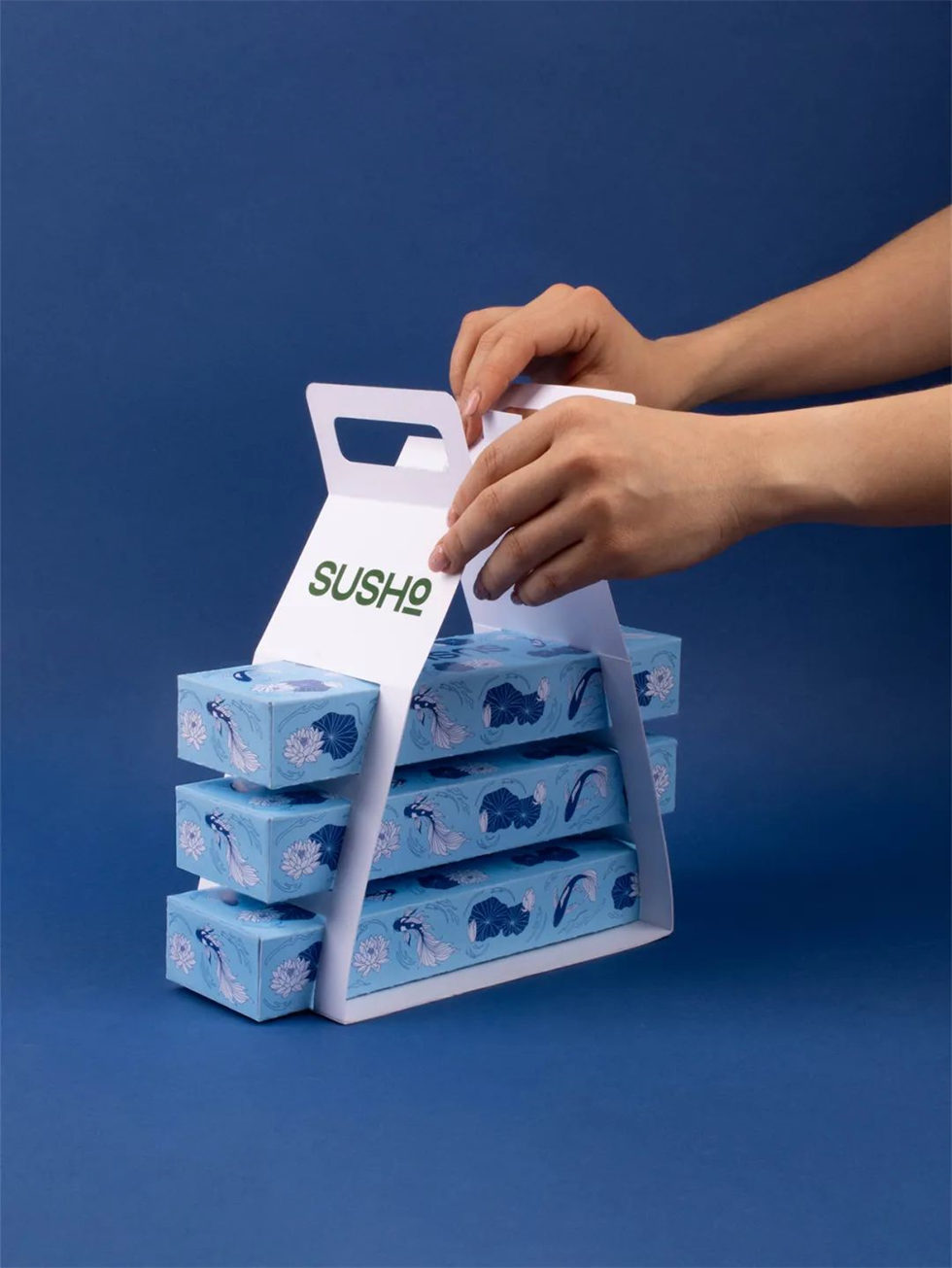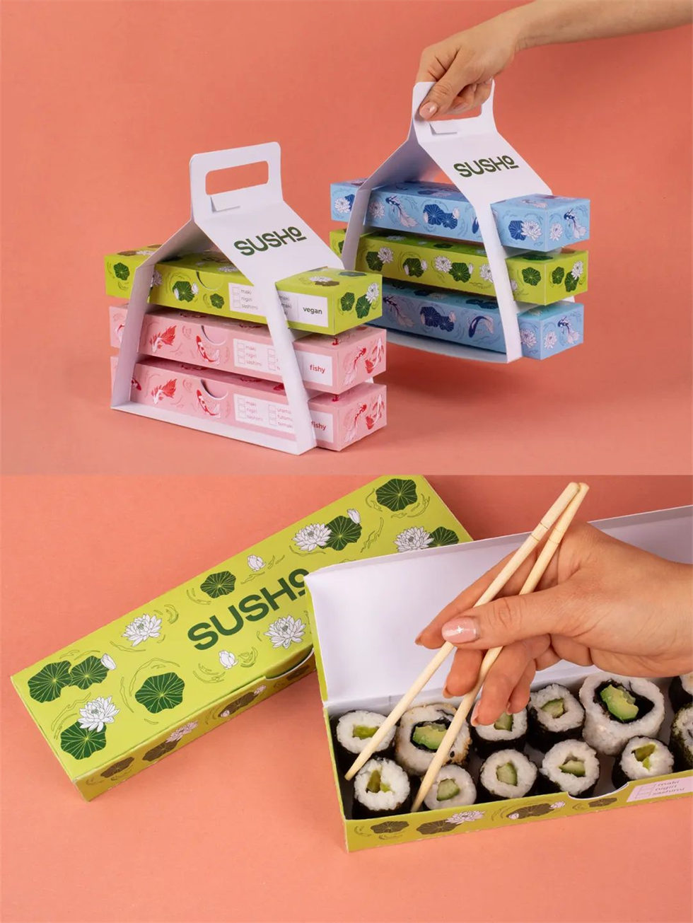 SUSHO是一個壽司品牌,盒子的外部容器(用于3個和6個壽司盒)使它們更容易攜帶。SUSHO壽司品牌設計項目的目的是提供替代外賣塑料包裝的替代解決方案。這個壽司品牌設計的插圖采用了錦鯉和睡蓮,同時使用了三種主要顏色是:藍色、綠色和橙紅色。綠色是純素壽司,藍色和橙紅色是混合壽司(純素和三文魚等)